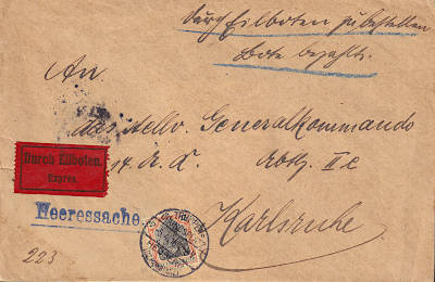 Feldpostbrief mit Eilzustellung vom 29.12.1916 (2. Periode) frankiert mit einer Marke a 25 Pfennig (=25 Pfennig; 0 Brief 25 Eilzustellung); bei dieser gebührenfreien Feldpostsendung wurde nur die Eilzustellungsgebühr frankiert |