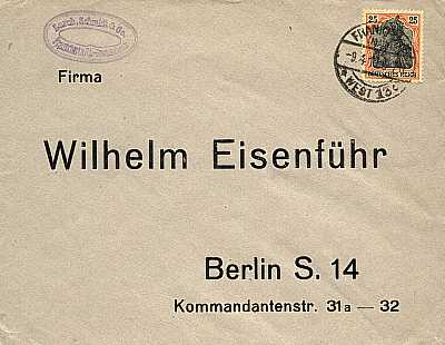 Inlandsbrief mit Eilzustellung vom 05.04.1916 (1. Periode) frankiert mit einer Marke a 25 Pfennig (=25 Pfennig; 0 Brief 25 Eilzustel- lung); bei dieser gebührenfreien Dienstsendung wurde nur die Eilzustellungsgebühr frankiert |
