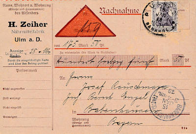 Inlandsdrucksache mit Nachnahme (1-50 g) vom 15.01.1919 (3. Periode) frankiert mit einer Marke a 15 Pfennig (=15 Pfennig, 5 Drucksache 10 Nachnahme) |