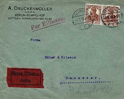 Inlandsbrief mit Eilzustellung (1-20 g) vom 04.12.1919 (4. Periode) frankiert mit 2 Marken a 35 Pfennig (=70 Pfennig, 20 Brief 50 Eilzustellung)