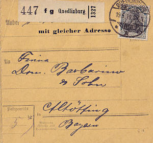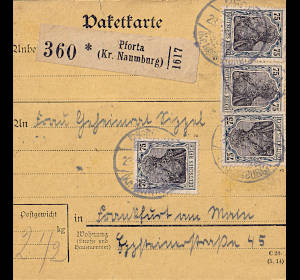 Inlandspaketkarte (2 500 g, > 75 km) vom 23.05.1922 (7. Periode) frankiert mit 12 Marken a 75 Pfennig (=9 Mark) |