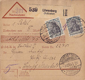 Inlandspaketkarte mit Nachnahme (2 500 g, > 75 km) vom 30.08.1920 (5. Periode) frankiert mit 4 Marken a 75 Pfennig (=3 Mark, 2 Paket 1 Nachnahme) |