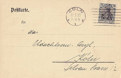 Inlandspostkarte vom 20.07.1922 (8. Periode) frankiert mit 2 Marken a 75 Pfennig (=1,50 Mark) |