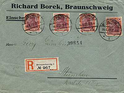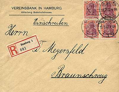Inland cover with registeration (21-100 g) from 14.06.1922 (7. Period) franked with 4 stamps a 1¼ Mark (=5 Mark, 3 cover 2 registeration) |