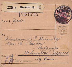 Inlandspaketkarte (5 000 g, > 75 km) vom 13.05.1922 (7. Periode) frankiert mit 3 Marken a 3 Mark auf 1¼ Mark (=9 Mark) |