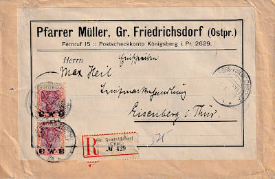 Inlandsbrief mit Einschreiben (101-250 g) vom 08.01.1922 (7. Periode) frankiert mit 2 Marken a 3 Mark auf 1¼ Mark (=6 Mark, 4 Brief 2 Einschreiben) |