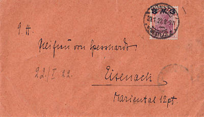 Inlandsbrief (21-100 g) vom 20.01.1922 (7. Periode) frankiert mit einer Marke a 3 Mark auf 1¼ Mark (=3 Mark) |
