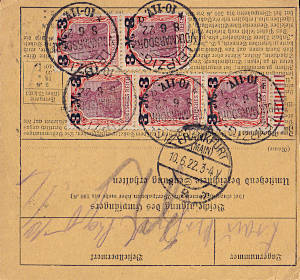 Inlandspaketkarte (10 000 g, > 75 km) vom 08.06.1922 (7. Periode) frankiert mit 6 Marken a 3 Mark auf 1¼ Mark (=18 Mark) |