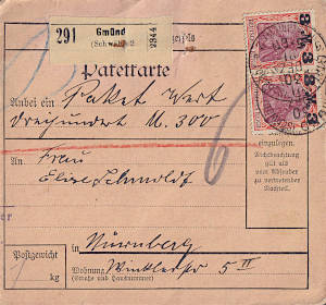 Inlandspaketkarte (2 000 g, < 75 km) vom 08.06.1922 (7. Periode) frankiert mit 2 Marken a 3 Mark auf 1¼ Mark (=6 Mark) |
