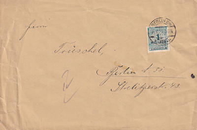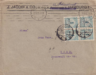 Local cover (1-20 g) from 27.10.1923 (21. Period) franked with 4 stamps a 1 Million Mark (=4 Million Mark) |