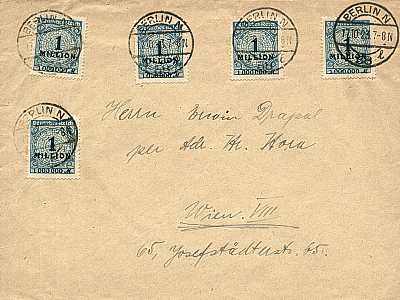 Foreign cover (1-20 g) from 17.10.1923 (20. Period) franked with 5 stamps a 1 Million Mark (=5 Million Mark); to Austria the inland fee was valid |