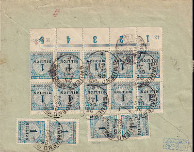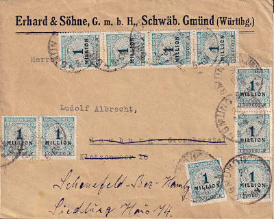 Inland cover (1-20 g) from 20.10.1923 (21. Period) franked with 10 stamps a 1 Million Mark (=10 Million Mark) |