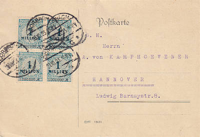 Inland postcard from 23.10.1923 (21. Period) franked with 4 stamps a 1 Million Mark (=4 Million Mark) |