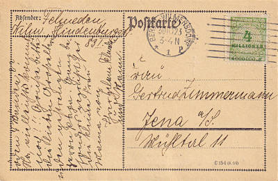 Inland postcard from 30.10.1923 (21. Period) franked with one stamp a 4 Million Mark (=4 Million Mark) |