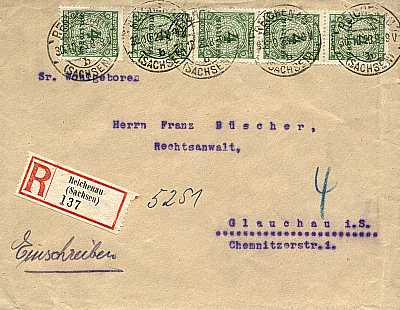 Inland cover with registeration (1-20 g) from 30.10.1923 (21. Period) franked with 5 stamps a 4 Million Mark (=20 Million Mark, 10 Million cover 10 Million registeration) |