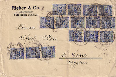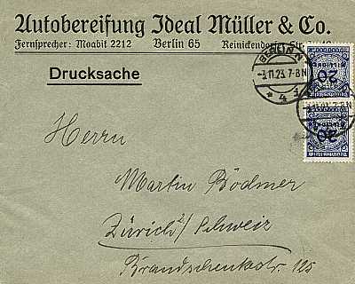 Foreign printed matter (1-50 g) from 03.11.1923 (22. Period) franked with 2 stamps a 20 Million Mark (=40 Million Mark) |