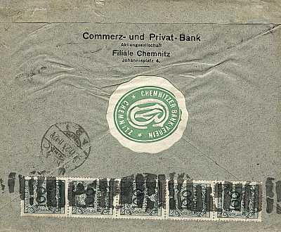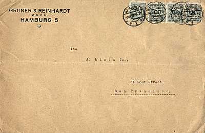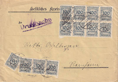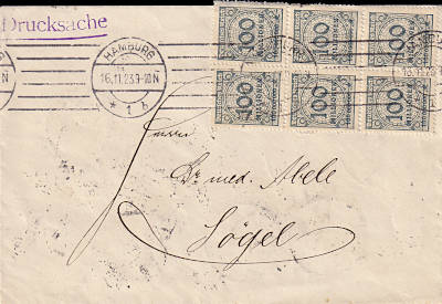 Foreign cover (41-60 g) from 03.11.1923 (22. Period) franked with 4 stamps a 100 Million Mark (=400 Million Mark) |