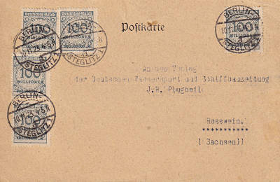 Local postcard from 07.11.1923 (23. Period) franked with 2 stamps a 100 Million Mark (=200 Million Mark) |