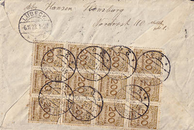 Inland cover (21-100 g) from 10.11.1923 (23. Period) franked with 7 stamps a 200 Million Mark (=1,4 Billion Mark) |