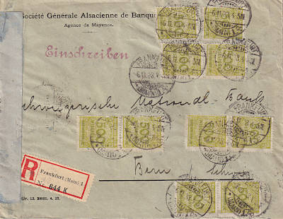 Foreign cover with registeration (1-20 g) from 06.11.1923 (23. Period) franked with 10 stamps a 500 Million Mark (=5 Billion Mark, 4 Billion cover 1 Billion registeration) |