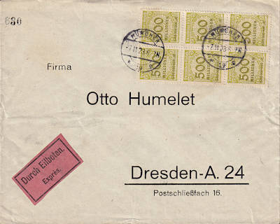 Inland cover with special delivery (1-20 g) from 07.11.1923 (23. Period) franked with 6 stamps a 500 Million Mark (=3 Billion Mark, 1 Billion cover 2 Billion special delivery) |