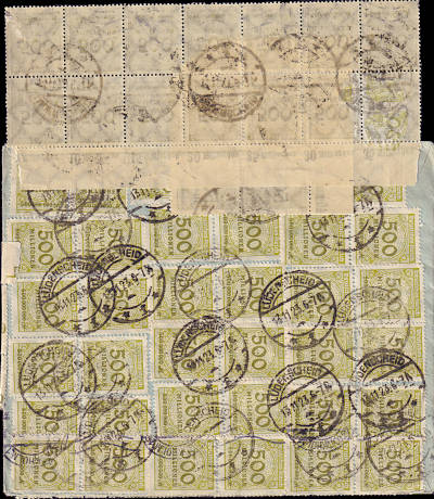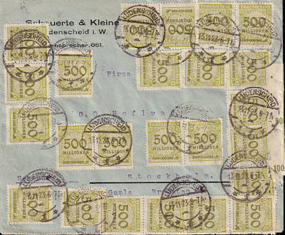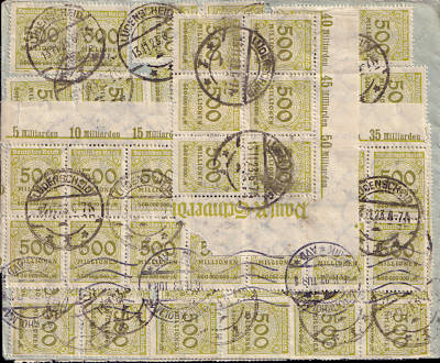 Foreign cover (1-20 g) from 13.11.1923 (24. Period) franked with 80 stamps a 500 Million Mark (=40 Billion Mark) |