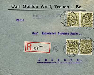 Inland cover with registeration (1-20 g) from 10.11.1923 (23. Period) franked with 4 stamps a 500 Million Mark (=2 Billion Mark, 1 Billion cover 1 Billion registeration) |