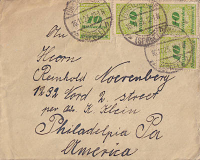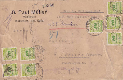 Foreign cover (1-20 g) from 19.11.1923 (24. Period) franked with one stamp a 10 Billion Mark (=10 Billion Mark); to Austria the inland fee was valid |