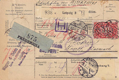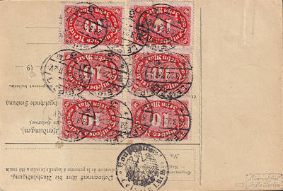 Auslandspaketkarte (3 900 g) vom 23.03.1922 (7. Periode) frankiert mit 7 Marken a 10 Mark (=70 Mark)