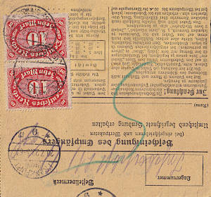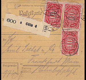 Inlandspaketkarte (11 500 g, > 75 km) vom 19.06.1922 (7. Periode) frankiert mit 3 Marken a 10 Mark (=30 Mark)