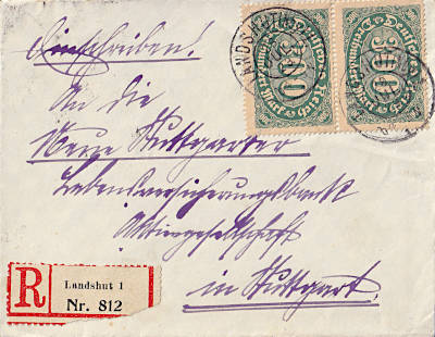 Inland cover with registeration (1-20 g) from 28.07.1923 (14. Period) franked with 2 stamps a 300 Mark (=600 Mark, 300 cover 300 registeration) |