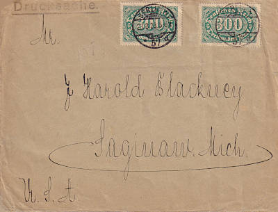 Foreign printed matter (1-50 g) from 23.08.1923 (15. Period) franked with 2 stamps a 300 Mark (=600 Mark) |