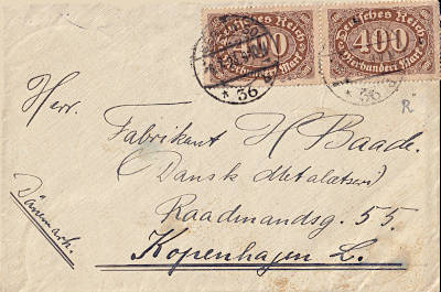 Foreign cover (1-20 g) from 06.07.1923 (14. Period) franked with 2 stamps a 400 Mark (=800 Mark) |