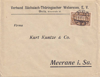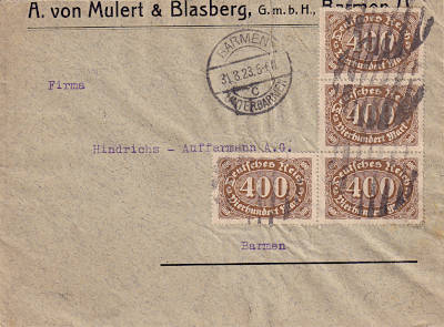 Local cover (1-20 g) from 07.08.1923 (15. Period) franked with one stamp a 400 Mark (=400 Mark) |