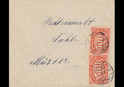 Inlandsbrief (1-20 g) vom 03.08.1923 (15. Periode) frankiert mit 2 Marken a 500 Mark (=1 000 Mark) |