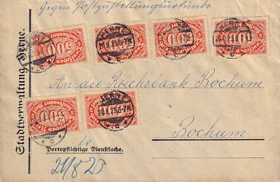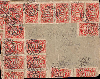 Auslandsbrief (1-20 g) vom 17.08.1923 (15. Periode) frankiert mit 6 Marken a 500 Mark (=3 000 Mark) |