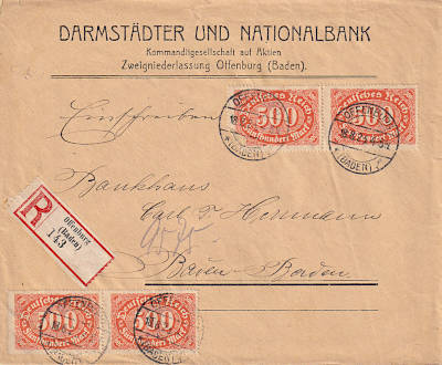Inlandsbrief mit Einschreiben (1-20 g) vom 18.08.1923 (15. Periode) frankiert mit 4 Marken a 500 Mark (=2 000 Mark, 1 000 Brief 1 000 Einschreiben) |