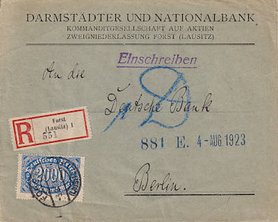 Inland cover with registeration (1-20 g) from 03.08.1923 (15. Period) franked with one stamp a 2 000 Mark (=2 000 Mark, 1 000 cover 1 000 registeration) |