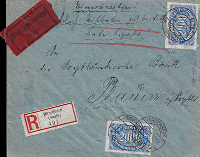 Inland cover with registeration and special delivery (1-20 g) from 03.08.1923 (15. Period) franked with 2 stamps a 2 000 Mark (=4 000 Mark, 1 000 cover 1 000 registeration 2 000 special delivery) |
