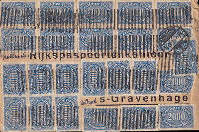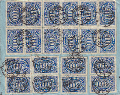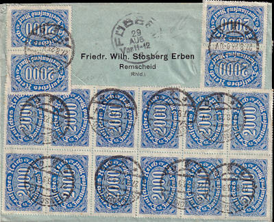 Inland cover with registeration (1-20 g) from 27.08.1923 (16. Period) franked with 20 stamps a 2 000 Mark (=40 000 Mark, 20 000 cover 20 000 registeration) |