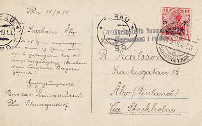 Foreign postcard from 14.09.1919 (3. Period) franked with one stamp a 10 Pfennig(=10 Pfennig)