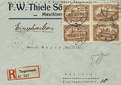 Inland cover with registeration (21-100 g) from 30.09.1922 (8. Period) franked with 4 stamps a 1,50 Mark (=6 Mark, 3 cover 3 registeration) |
