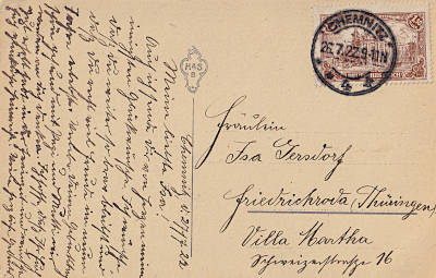 Inland postcard from 26.07.1922 (8. Period) franked with one stamp a 1,50 Mark (=1,50 Mark) |