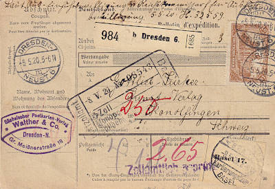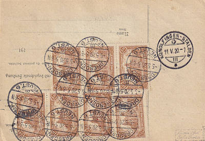 Foreign parcel card (4 000 g) from 05.05.1920 (4. Period) franked with 8 stamps a 1,50 Mark (=12 Mark) |