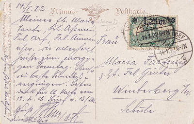 Inland postcard from 14.01.1922 (7. Period) franked with one stamp a 1,25 Mark on 1 Mark (=1,25 Mark) |