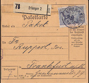 Inland parcel card (7 000 g, > 75 km) from 07.07.1922 (8. Period) franked with one stamp a 20 Mark (=20 Mark) |