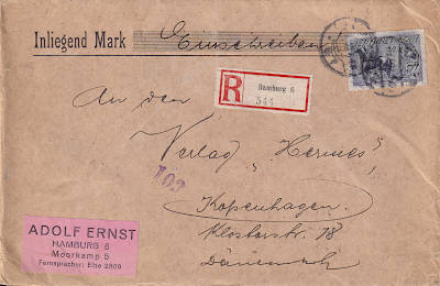 Foreign cover with registeration (81-100 g) from 02.07.1922 (8. Period) franked with one stamp a 20 Mark (=20 Mark, 18 cover 2 registeration) |