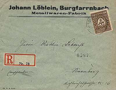Inlandsbrief mit Einschreiben (1-20 g) vom 02.10.1922 (9. Periode) frankiert mit einer Marke a 10 Mark (=10 Mark, 6 Brief 4 Einschreiben) |