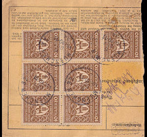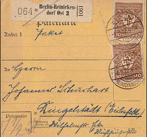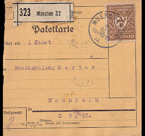 Inlandspaketkarte (7 500 g, > 75 km) vom 06.09.1922 (8. Periode) frankiert mit 2 Marken a 10 Mark (=20 Mark) |