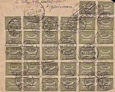 Ortsbrief mit Einschreiben (21-250 g) vom 16.02.1922 (7. Periode) frankiert mit 40 Marken a 10 Pfennig (=4 Mark, 2 Brief 2 Einschreiben) |